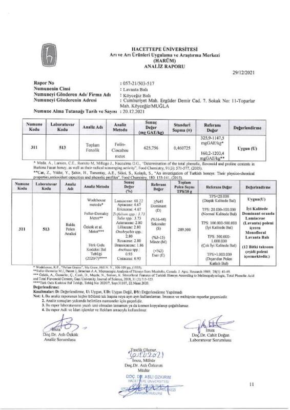 Köyceğiz Balı Lavanta Balı Antioksidan ve Polen Sertifikası